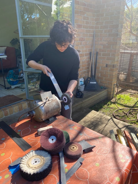 Once the serving tool has been formed, the metal has to be ‘finished’. The surface finish of the metal is the final part of the making process, taking the tool from rough to smooth and lovely to hold and to view.