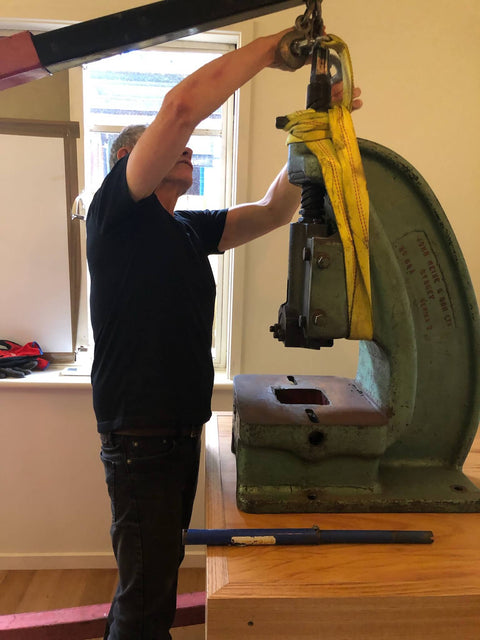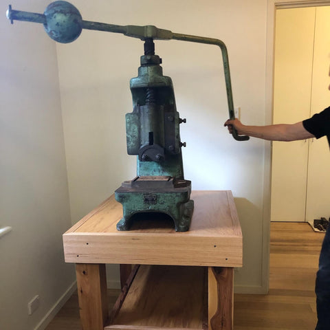 The pieces are then formed using a range of machinery and tools in our workshop, from a series of traditional metal working hammers, through to the 250kg vintage fly press. This beautifully engineered piece of machinery was made in Australia in the 1940’s. It was originally used for making metal samples prior to a production run. We were lucky to find one in such fine condition.